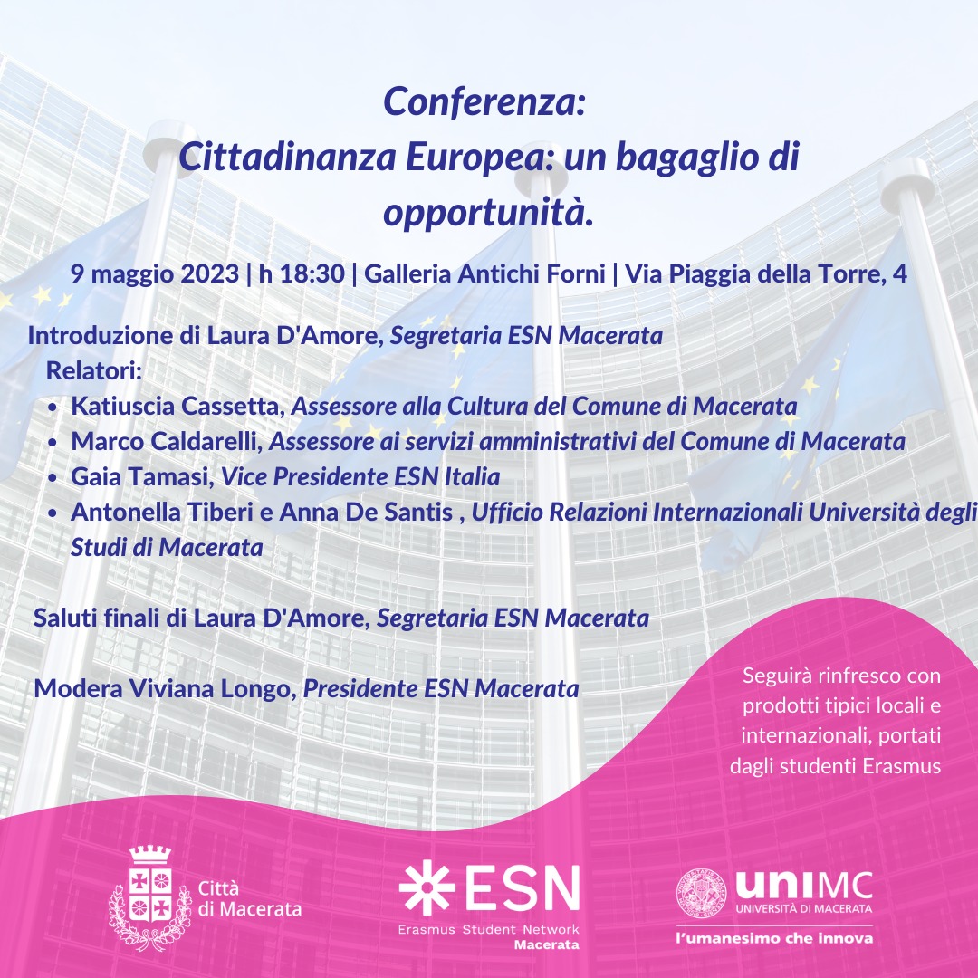 La conferenza dal titolo “Cittadinanza Europea: un bagaglio di opportunità”, avrà luogo martedì 9 maggio 2023, alle ore 18:30, presso la Galleria Antichi Forni, Via Piaggia della Torre, 4, Macerata (MC).