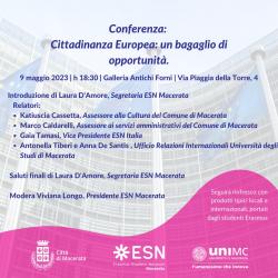 Il 9 maggio 2023, si terrà alla Galleria Antichi Forni, Macerata (MC) la conferenza in occasione dell'Europe Day organizzata da Erasmus Student Network Macerata.